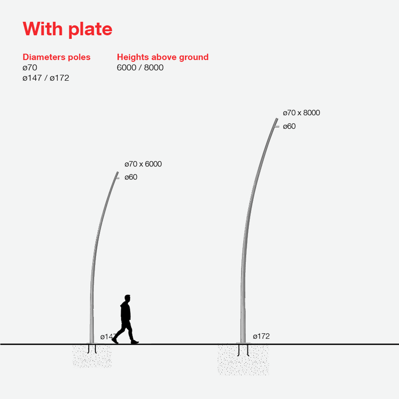 • The poles are fitted with a Ø60mm diameter single or double lateral cylindrical attachment.