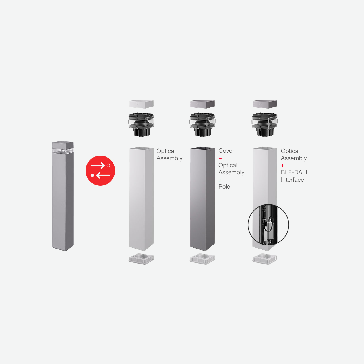 - Pole retrofit kit made of extruded aluminium with a sheet aluminium lamp cover and a die-cast aluminium alloy base for fixing to the ground. The poles, lamp covers and base are available in White, Black, Rust Brown and Grey.