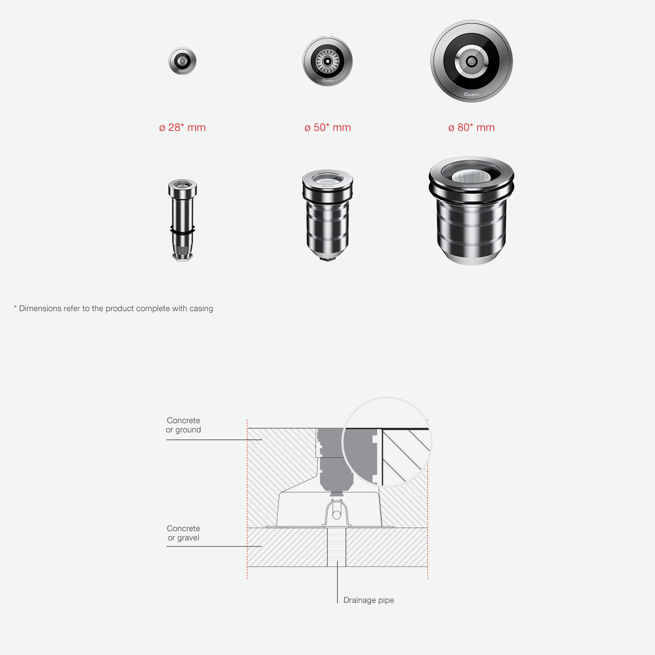 • Body and frame flush with floor in AISI 304 stainless steel installed without visible screws, hardened safety glass; A2 stainless steel cable gland complete with output power supply cable type.2x1mm². The cable is provided with IP68 anti-transpiration device.
