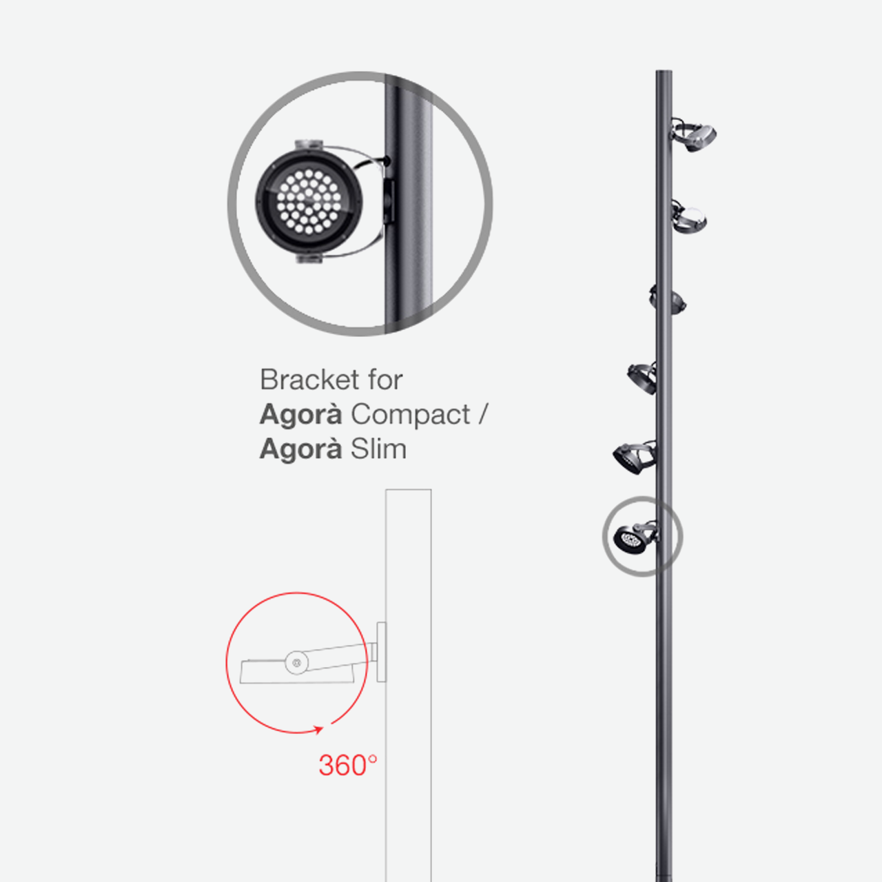 - Installation on pre-perforated poles with a minimal design flange and single or double arms for Ø102 - Ø120mm cylindrical-conical poles (Agorà Compact version and Agorà Slim version).