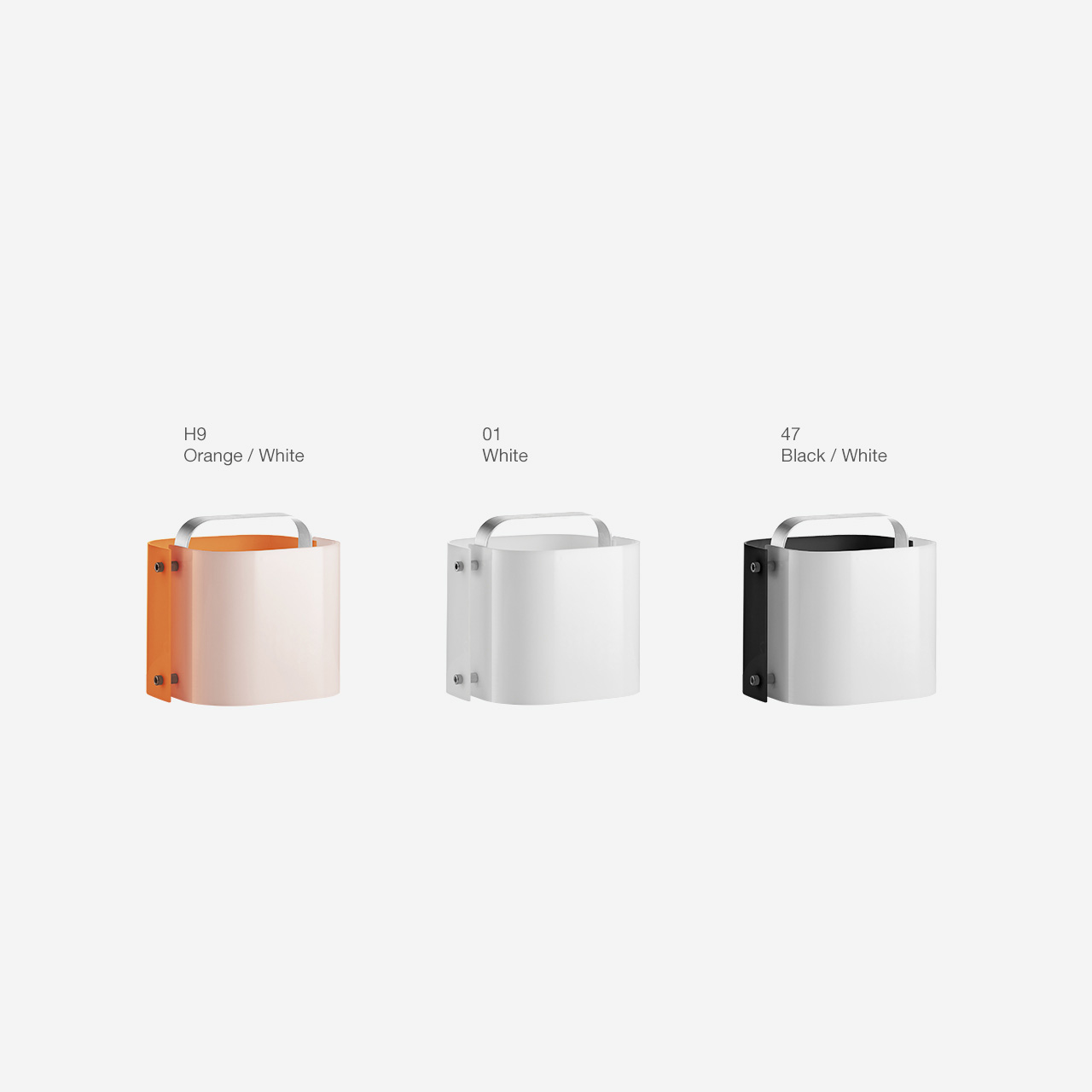 Table lamp consisting of two identical thermoformed shells of 100% recycled and recyclable PMMA, mounted staggered on the same axis, thanks to aluminum joints that look like the cufflinks of a cuff. Equipped with polished aluminum handle.