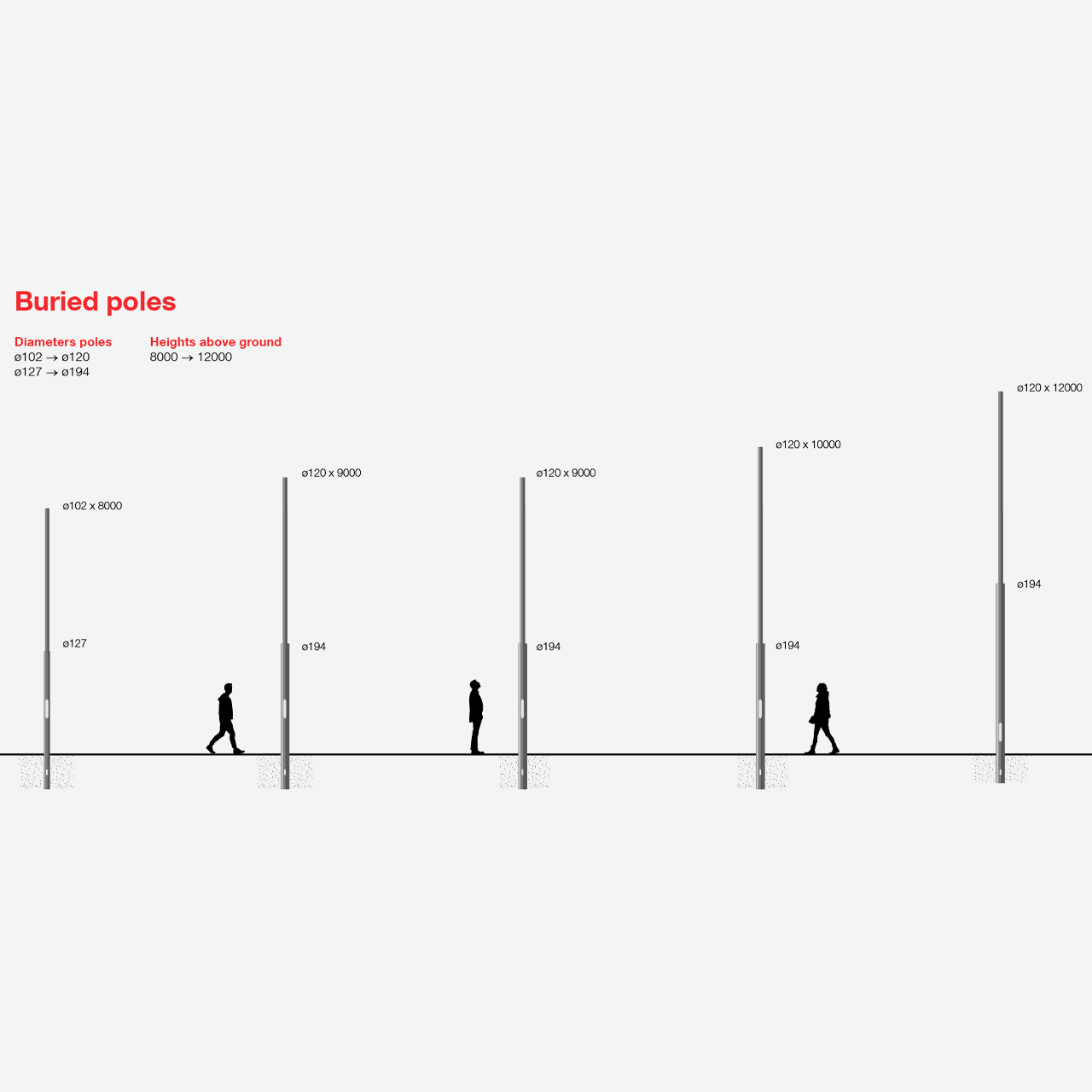 • The buried poles are fitted with a slot for feeding in cables (150x150mm).