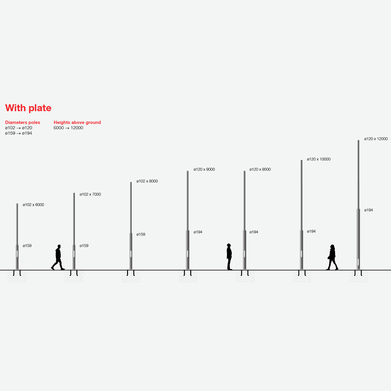 • Poles made of 70 micron hot-dip galvanised EN10025- S235JR or EN10025-S355JR steel in compliance with the UNI EN ISO 1461 (EN40-5) standard.